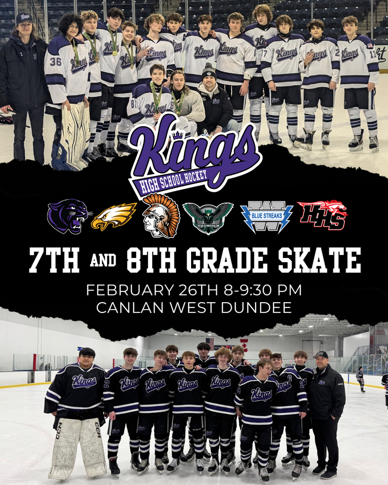 7th and 8th graders that will be attending Huntley, McHenry, Hampshire, Jacobs, Woodstock or Woodstock North High Schools can come out and skate with the Kings! 👑🏒 Meet our coaches and hear about how high school hockey works!